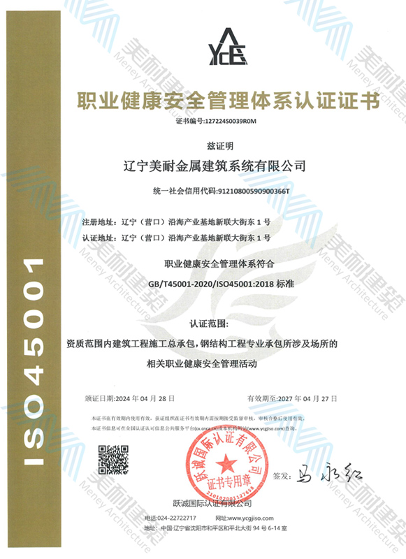 遼寧美耐金屬建筑系統(tǒng)有限公司位于遼寧(營口)沿海產業(yè)基地,專注于預制金屬建筑系統(tǒng)領域,是一家集工業(yè)建筑設計、制作、施工及相關的技術咨詢與服務為一體的綜合性服務企業(yè)。作為國家鋼結構協(xié)會會員、中國建筑金屬結構協(xié)會會員單位與國家高新技術企業(yè),美耐建筑集建筑工程施工總承包、鋼結構工程專業(yè)承包等多種資質于一身,并擁有22項鋼結構建筑領域專利,9項軟件著作權。